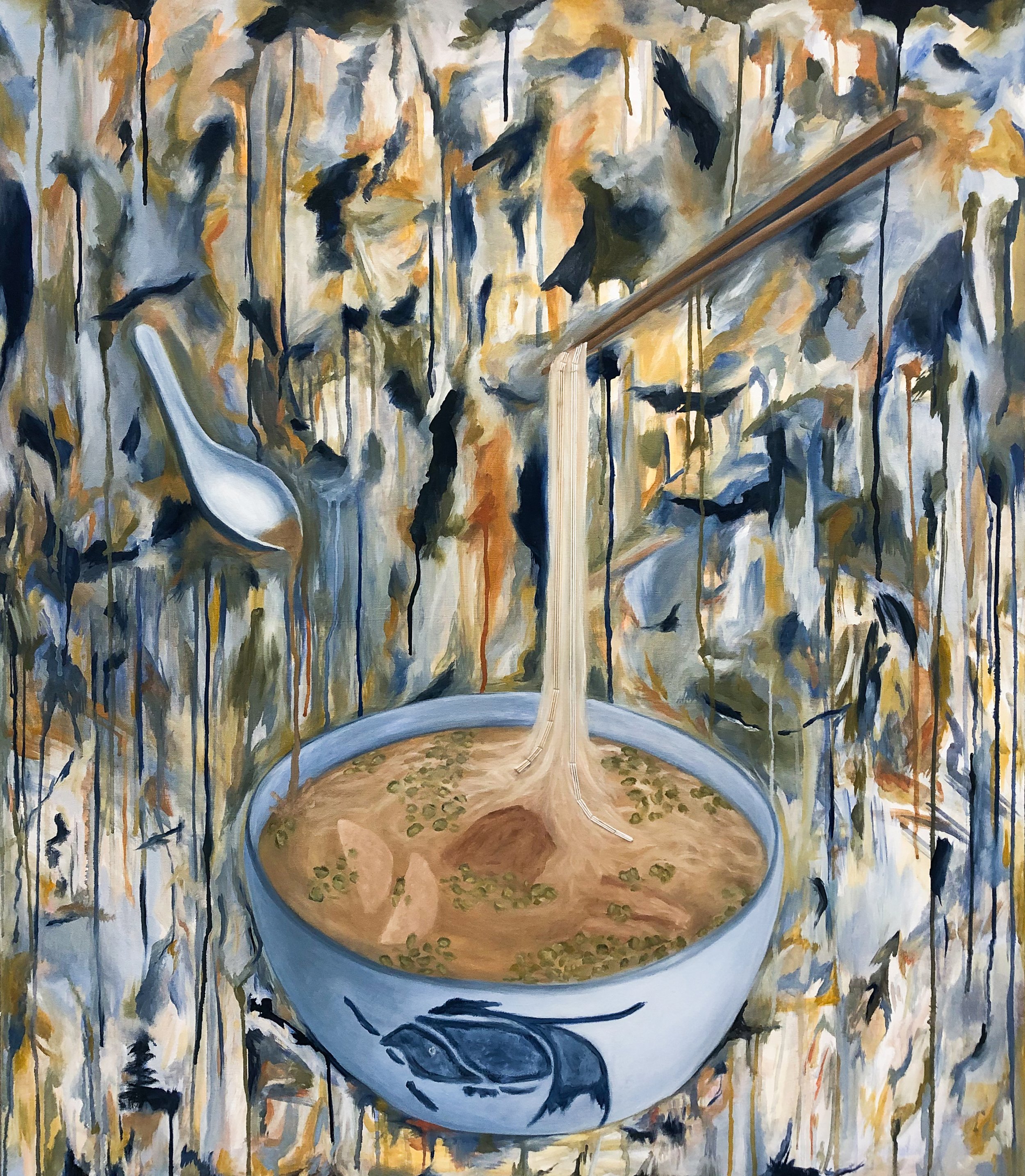 Oil and embroidery thread on canvas, 40×46”, 2018